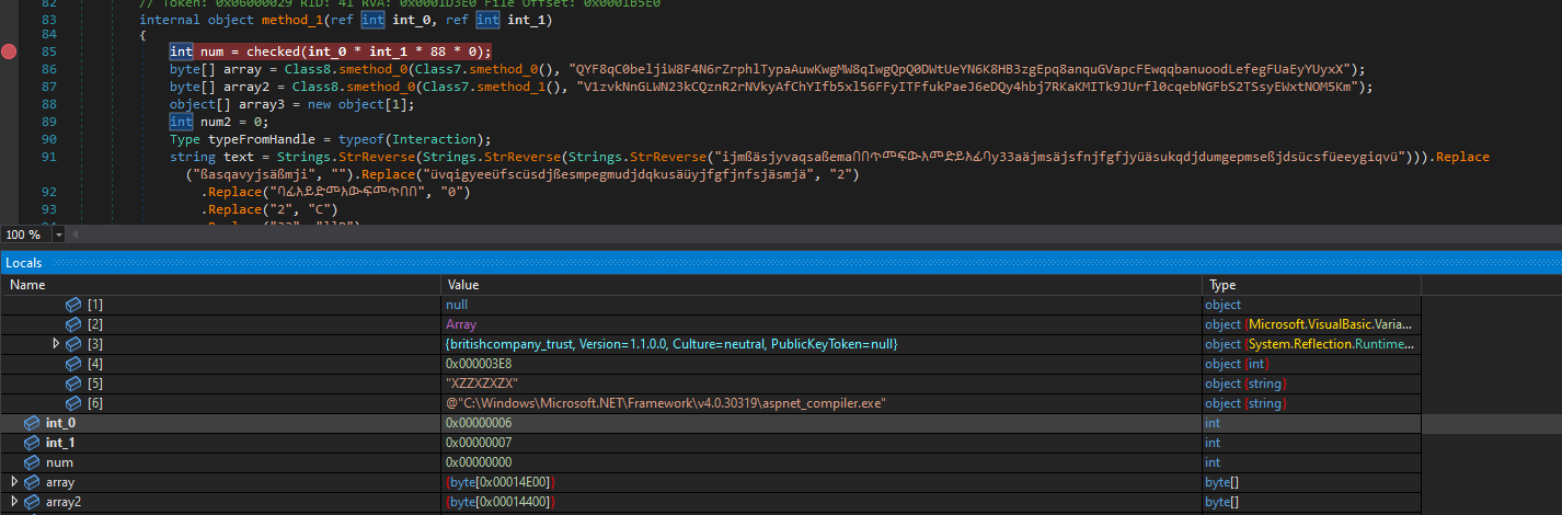 Opening the deobfuscated binary in dnSpy, we are then able to view the entry point Class8.Main. Inside this Class there is then a method labeled smethod_0 that contains the decrypter function that is called by the object method_1, this object contains strings that are passed for decryption.